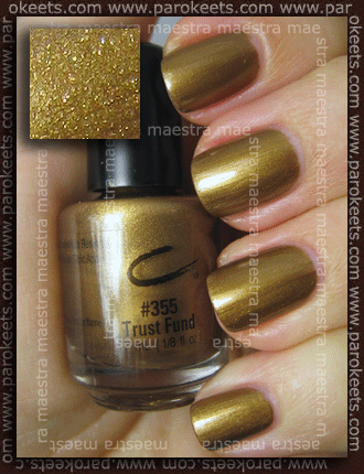 Pred kratkim sem iz Anglije naročila komplet šestih mini lakov za nohte znamke Creative Nail Design ali krajše CND. Med njimi je bil tudi lepotec z imenom Trust Fund, za katerega je pisalo, da je zlat, a je mnogo več kot samo zlat. Vsekakor ni prava rumena zlata, ampak ima v sebi tudi olivno zeleno. Odtenek je sicer nenavaden, a meni je neznansko všeč. Z nanašanjem nisem imela nobenih težav. Na fotografiji sta dve plasti.