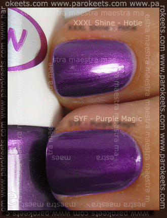 Hotie from the XXXL Shine line looks identical to Purple Magic in the bottle. But when applied on the nail, there is a difference between the two of them. Purple Magic is more pigmented, that’s why after two coats it looks darker that Hotie with two coats. Hotie has some frost finish which Purple Magic does not have. Both applied well. The difference in color is very subtle. Maybe it would be easier for you to decide between the two of them if you consider that SYF line has flat brush and the formula is more pigmented.