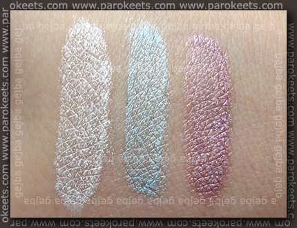If we look at the shimmer present in eyeshadows – blue one has really fine one, while violet and white eyeshadows have larger simmer in them. I especial am not fond of combination – violet base and silver simmer.