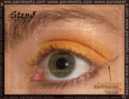 6. korak – senčenje gube: Z Goshevim čopičem za senčenje gube sem v gubo nanesla senčilo Earthtones Taupe. Nanašanje senčila v gubo poteka s “tapkanjem” in krožnimi gibi. Lok nad gubo je narejen tako visoko, da se senčilo vidi tudi, ko je oko odprto. Skoraj zmeraj naredim dokaj visok lok, saj ga potem vedno zabrišem ali “zablendam” z osvetljevalcem.