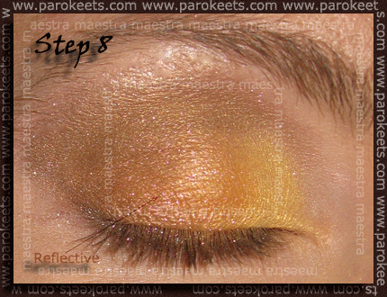 8. korak: Na prehod med senčiloma Cornflower in Earthtones Taupe sem dodala senčilo Reflective, ki celoten izgled nekoliko poživi s svojim presevanjem. Reflective sem nanesla z Goshevim čopičem za nanašanje senčila.