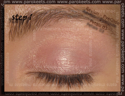 1. korak – nanos podlage: Na celotno veko sem nanesla kremno senčilo EyeGlide znamke Ravlon v nežnem mareličnem odtenku Petals 03. Podlaga je nanesena zelo na tanko.