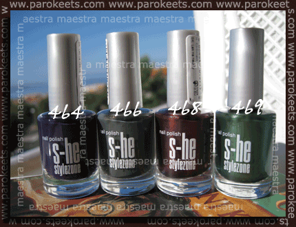 Med sprehajanjem po Zadru sem (seveda) zavila v DM pogledati, ali imajo kaj novega. Ob pregledovanju stojala znamke S-he Stylezone, se mi je pogled ustavil na odtenkih, za katere se mi je dozdevalo, da jih še nisem videla. Nisem bila prepričana, ali so odtenki dejansko novi ali se mi samo dozdeva, saj so popolnoma nespektakularno sedeli med ostalimi stekleničkami na stojalu. Vseeno sem se odločila in kupila štiri, ki so me resnično pritegnili, čeprav dejansko noben ni bil dolgočasen. Z menoj so odšli odtenki z numeričnimi imeni 464, 466, 468 in 469.