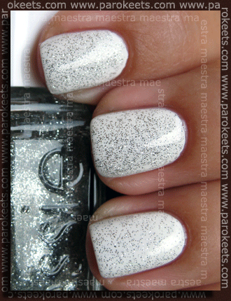 Snežno belino sem “nadgradila” z dvema plastema srebrnih bleščic v prozorni osnovi. Lak je znamke Essie in se imenuje Silver Bullions.