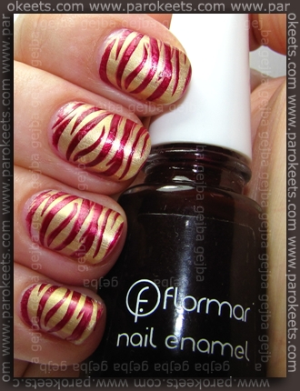 Uff… spremenila bi predvsem barvo odtisa. Ali pa za to barvno kombinacijo izbrala drugi vzorec. Ne vem, tvoja kombinacija mi nikakor ni všeč. Kot bi tekla kri po tvojih nohtih, kar mi v splošnem ni nič napačnega za nail art. Ampak v tem primeru mi ne izgleda cool… Sicer pa tale Flormar očitno odlično deluje. :nails:
