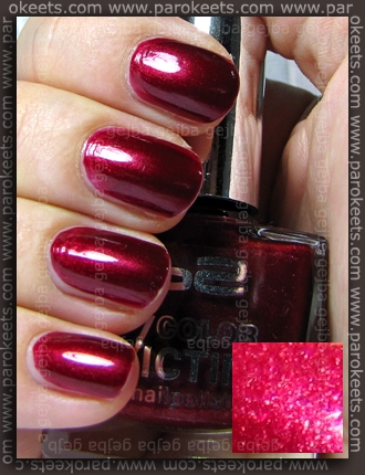 Gre za zelo lep temno rdeč lakec, ki v kombinaciji s hladnim šimrom potegne bolj na škrlatno barvo. Na soncu je odtenek bolj tople barve, ker pride do izraza toplejši šimer.
