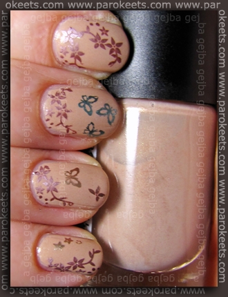 I’m not fan of nude nail polishes but this one is nice. Beige base with gold shimmer is the combination I just had to try out on me. But I quickly got bored of the “naked” nails, so I played a little bit with Essence stampy plates and China Glaze Khrome polishes.