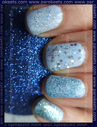Holiday Blues mi je bil takoj všeč brez vseh dodatkov in okraskov. Tudi ta je krem, za popoln nanos zadostujeta dve plasti. Jaz sem v spodnjem primeru nanesla tri in se vidi, da sem krepko pretiravala… :blush: