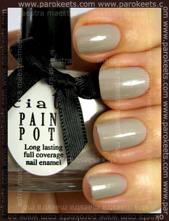 Sharp Tailoring je svetlo siv odtenek z drobnim srebrnim šimrom. Odtenek povleče rahlo na bež stran in ne na modro stran. Tudi ta odtenek je izredno posrečen in prav svež tudi za pomlad. Na fotografiji sta dve plasti.