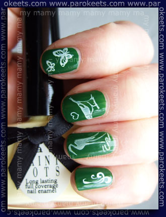 For todays manicure I used green Ciate Paint Pots – Stiletto, white Konad and images from: Chez-Delaney H30, Essence and Konad M3.