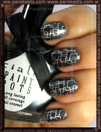Za osnovo sem uporabila dva nanosa Ciate – Velvet Tuxedo. Čez sem odtisnila vzorec iz IP H22 s China Glaze – Sci-Fi odtenkom iz Khrome kolekcije.