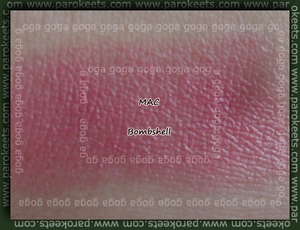 Next one is also MAC‘s Bombshell lipstick. Also nice pinkish shade with touch of peachy and red, but not much.