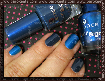 Medtem ko sem preverjala, ali je Muller že dobil kaj novih reči od Essence, je mojo pozornost pritegnil en odtenek. Na polici je čepel čudovit temno moder odtenek s sivim pridihom in majhnimi modrimi krpicami. Vzela sem ga iz police in pogledala ime … Underwater. Nakremžila sem se in pomislila: “Kaj? A ni to nekam znano ime?” Lepotca sem kupila in doma preverila, ali so bila moja predvidevanja pravilna. Da. Izkazalo se je, da v zbirki že imam Essence Colou&Go lak z identičnim imenom, a drugačno vsebino. Tukaj je dokaz …