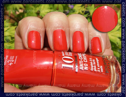 Bourjois 10 days no. 11 is red shade with lots of orange in it. Good coverage, 2 layers. This shade contains very fine (almost invisible) shimmer.