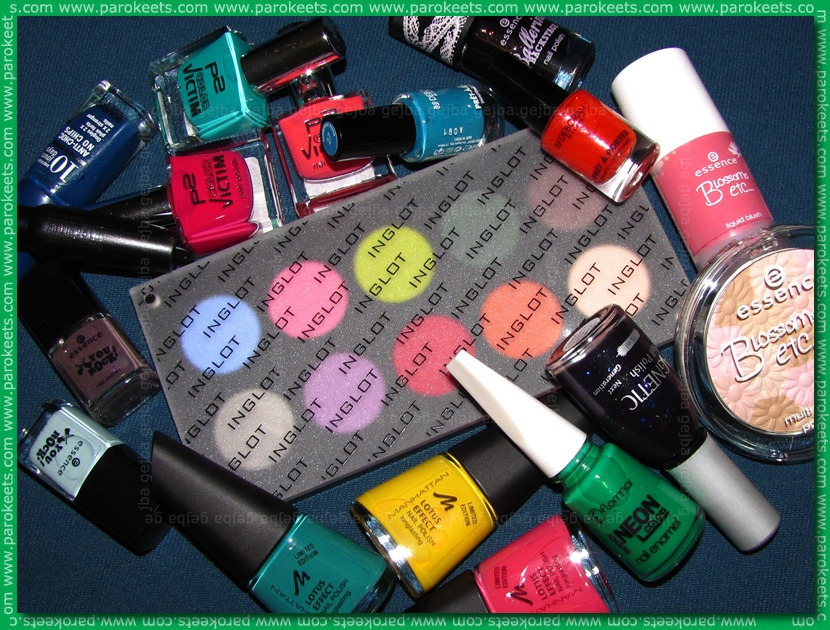 - Essence: Flowerkissed blush; Flower Power powder, Grand-plie in Black polish; Speed of Light Blue polish, Love, Peace and Purple polish;