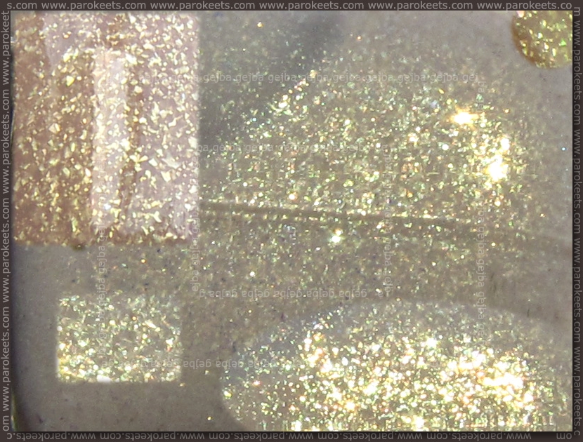 Alessandro Wild Angel ima bežkasto osnovo in veliko drobcenih rumenkasto zelenkastih krpic (tudi kakšna bakrena se najde). Gre za precej prosojen lak, tako da so potrebne tri plasti, da dobite tole …
