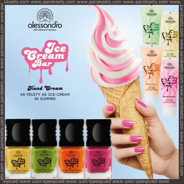 Nova Alessandro omejena kolekcija je pisana na kožo vsem, ki ljubite odišavljene proizvode. Ice Cream Bar LE sestavljajo štirje vonji (pri čemer se vonj kreme ujema z lakom za nohte): Vanilla-Milk (vanilija-mleko), Mango-Papaya (mango-papaja), Lime-Vanilla (limeta-vanilja), Strawberry-Mint (jagoda-meta).