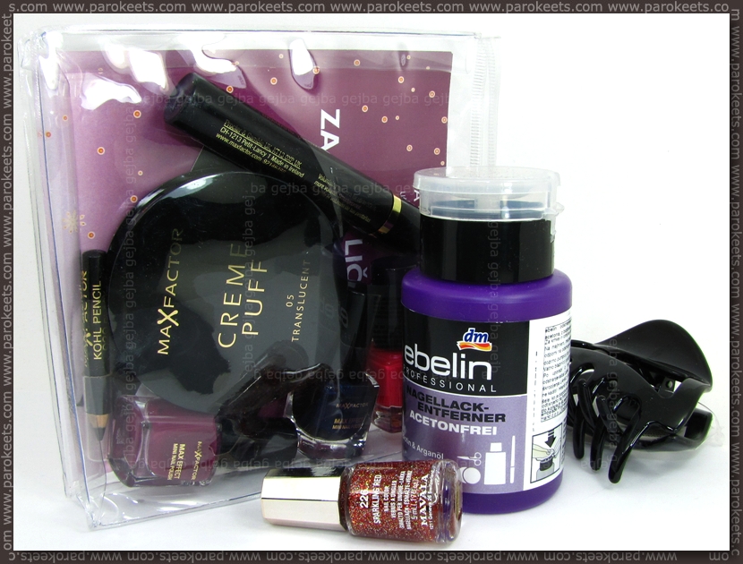 V Müllerju sem opazila 2 zelo zanimivi zadevi. Max Factor je olikoval 2 seta izdelkov za 9,59 EUR. Sama sem kupila set z bolj živahnimi laki za nohte (Hot Pink, Intense Plum, Cloudy Blue), Creme Puff v odtenku 05 Translucent, 2000 Calorie maskaro, mini Kohl Pencil v 020 Black ter testerjem Face Finity v Natural 50. Meni se je zdela zelo dobra kupčija. :thumb: