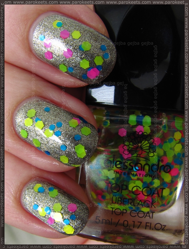 I think these neon glitter toppers are great fun! I would recommend wearing this polish over a white of pastel shade, makes the colors pop!