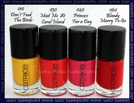 Catrice bottles: 010 Don’t Feed The Birds, 030 Meet Me At Coral Island, 040 Princes For a Day, 060 Bloody Marry To Go