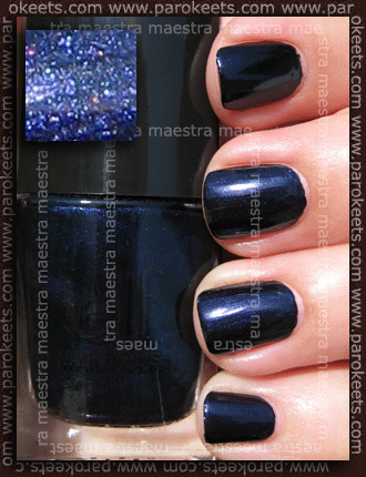Dark Navy je temno moder odtenek z modrim in vijoličnim šimrom. V slabši svetlobi izgleda skoraj črn, na sončku pa šimer prav zaživi. Lak je zelo gost in ga je bilo zaradi tega težje nanašati. To bom popravila z nekaj kapljicami razredčevalca lakov za nohte. Na fotografiji sta dva nanosa.