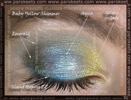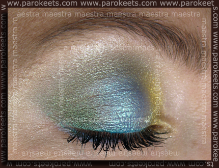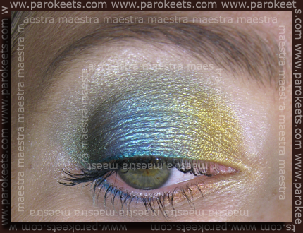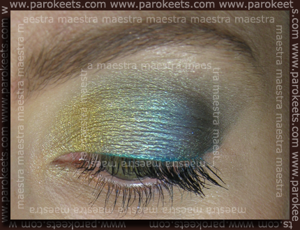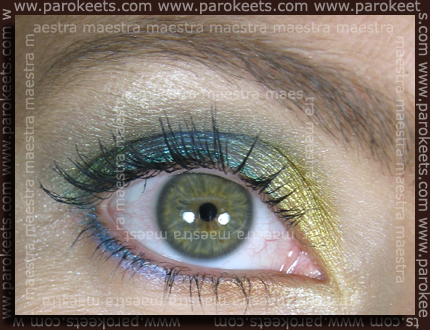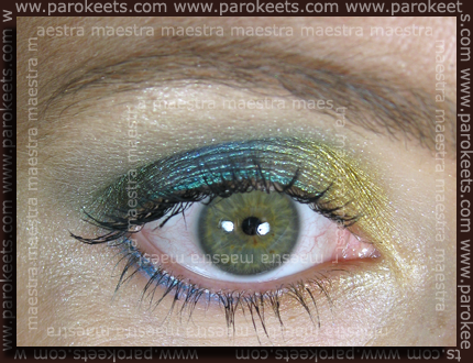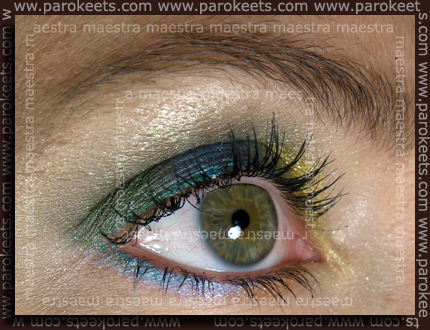 V bistvu gre za EOY(esterday). :D Zvečer enostavno nisem našla časa, da uredim slike in jih objavim. Tako so na vrsti danes. Senčila, ki sem jih uporabila: Gosh – Golden Gate, Aqua in Emerald, Sweetscents – Baby Yellow Shimmer (kot osvetljevalec). Uporabila sem turkizno črtalo za oči znamke Essence iz Into The Ocean TE. Pod spodnjimi trepalnicami sem uporabila svetlo moder svinčnik znamke Gosh v odtenku Ocean Mist.