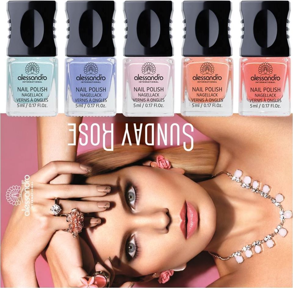 Alessandro is pursuing fall-winter trend with majority of solid colors + glittery topper. They named their spring 2015 edition Sunday Rose. With little bonus – peach, mint and coral shade available in regular and Striplac version.