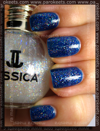 Power Dressing je verjetno najlepša modra v moji zbirki. Prava kraljevsko modra s krem “jelly” finišem. Zaradi “jelly” finiša je nanos rahlo progast. Verjetno izgleda najlepše s tremi plastmi. Na fotografijah spodaj sta le dve plasti. Za tri plasti nisem imela časa. V bistvu pa sem že v naprej načrtovala dodatek bleščic, ki pa prekrijejo večino nepravilnosti.