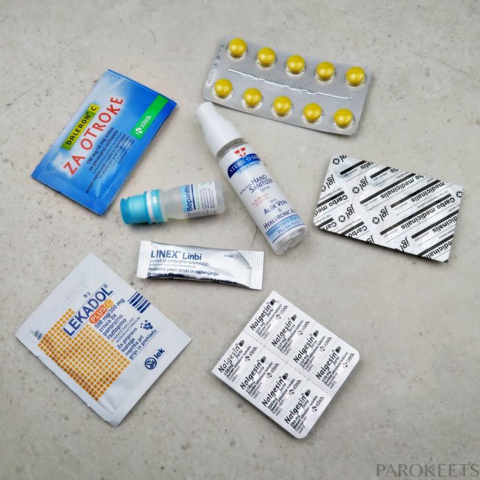 Kapljice za oči, probiotiki (BioKult za odrasle in Linex Limbi za malčico), vitamini in minerali (vitamin D in Mg, ki sta redno na sporedu), oglje, Nalgesin, Rennie (zgaga po poletnih pregrehah), razkužilni robčki …